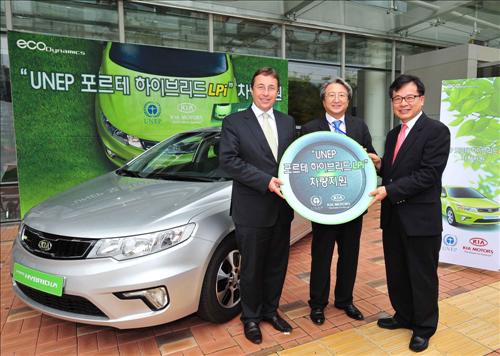 기아차는 지난 20일 대전 컨벤션센터에서 오 영 판매사업부장과 아킴 슈타이너 UNEP 사무총장이 참석한 가운데 기증식을 열었다. 슈타이너 사무총장은 "하이브리드 기술이 적용된 자동차는 연료 소비와 이산화탄소 배출량을 줄여 지구 온난화 방지에 큰 도움이 될 것"이라며 "하이브리드 자동차를 타는 사람들은 미래의 환경을 생각하는 소비자"라고 말했다고 회사 측은 전했다. UNEP에 전달된 포르테 하이브리드 LPi는 슈타이너 사무총장이 방한할 때마다 의전차량으로 사용된다. 평소에는 UNEP 한국위원회가 친환경 활동을 벌이는 데 활용될 예정이다. |