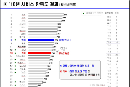 기아차는 756점으로 작년보다 7계단 상승한 13위에 올랐다. 제이디파워의 이 조사는 구입 후 3년 이내 딜러의 정비서비스를 받았던 소유주를 대상으로 ▲차량수리 ▲수리 후 차량 인도 ▲고객 응대 ▲차량 입고 ▲딜러 시설 등 총 5개 항목에 대한 만족도를 조사한 것으로, 점수가 높을수록 높은 서비스 만족도를 나타낸다. 현대차가 기록한 771점은 혼다(760점), 도요타(741점), 닛산(731점) 등 아시아권 일반 브랜드를 모두 제친 것이며, 독일 폭스바겐(764점)보다도 높은 수치다. 현대.기아차 관계자는 "서비스 만족도는 현지에 기반을 둔 미국 메이커의 강세가 두드러진다"며 "아시아 업체를 비롯한 대부분의 외국업체가 고전하는 상황에서 일본 브랜드를 압도하는 현대.기아차의 상승세는 큰 의미가 있다"고 자평했다. 고객 서비스 만족도는 제품 품질 만족도와 함께 고객의 보유 만족도에 직접적인 영향을 미치는 것으로, 업계에서는 보유 고객의 신차 구매와 직결된다는 점에서 중요한 지표로 간주되고 있다. |