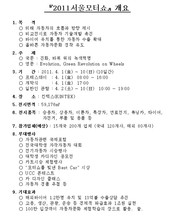 | 서울모터쇼조직위원회(위원장 허 문)는 2011년 4월 1일부터 10일까지 10일간 킨텍스에서 개최되는 "2011서울모터쇼"의 주제를 “진화, 바퀴 위의 녹색혁명”으로 확정 발표했다. 이번 "2011서울모터쇼"의 주제는 공모를 통해 접수된 총 1,073점의 출품작을 심사한 결과 왕정호氏(부산대 기계공학부 4학년)의 응모작이 최종 선정됐다. "2011서울모터쇼"주제인 “진화, 바퀴 위의 녹색혁명(Evolution, Green Revolution on Wheels)”은 자동차에 구현되는 친환경 첨단기술을 통해 인간과 자연을 보호하는 방향으로 진행되고 있는 그린 카의 개발 트렌드 및 자연과 함께 달리는 자동차의 긍정적 이미지를 표현했다고 서울모터쇼조직위원회는 설명하였다. 한편, 2011년 4월 1일부터 10일까지 10일간 개최되는 "2011서울모터쇼"는 국내 유일의 OICA(세계자동차공업연합회) 공인 국제모터쇼로 승용차, 상용차, 이륜차, 특장차, 연료전지, 튜닝카, 타이어, 부품 및 용품 등 자동차 관련 전품목이 전시되어 세계 자동차시장의 트렌드와 신기술동향을 제시할 예정이다. "2011서울모터쇼"는 국내 완성차메이커 및 부품업체를 포함해 국내업체 120여개, 해외업체 80여개 등 총 15개국 200여개 업체가 참가하여 신차, 컨셉트카 및 하이브리드카, 연료전지차, 전기자동차, 클린디젤차 등 환경친화적인 자동차 등을 대거 출품 전시한다. 또 전기자동차 시승행사, UCC 콘테스트, 카트시승 체험행사, 카 디자인 클래스 등 관람객이 직접 참여할 수 있는 다양한 부대행사와 자동차관련 국제포럼을 개최하는 등 100만명 이상의 관람객이 찾는 최대 규모의 행사가 예상된다 |