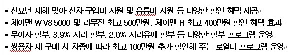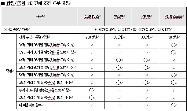 쌍용자동차의 1월 차량 판매 조건에 관한 내용은 회사 홈페이지(www.smotor.com)를 참고하거나 가까운 영업소(1588-3455)로 문의하면 된다. |