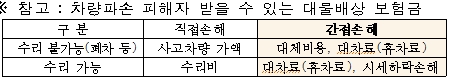 | "교통사고로 자동차를 폐차한 A씨는 1년 후 자동차를 구입하면서 자비로 지출한 등록세·취득세를 보험사에 청구하는 것을 잊고 있었으나 손해보험사로부터 등록세·취득세를 보상해준다는 연락을 받고 놓칠 뻔했던 보험금을 지급받을 수 있게 되었다." 손해보험협회는 내년 상반기중 신규차량 대체여부 확인 시스템이 구축되는대로 사고 피해자에 대한 이러한 간접손해보상금을 직접 챙겨주기로 했다. 교통사고로 차량파손 등의 손해를 입은 피해자는 상대방 보험사(대물배상)로부터 손해(직접 및 간접손해)를 보상받을 수 있으나, 간접손해보험금 중 특히 대체비용*의 경우 피해자의 개별적 청구가 없으면 보험사는 동 비용의 발생여부에 대하여 확인하기가 현실적으로 곤란했다. (*차량수리가 불가능한 경우 새로운 차량구입시에 소요되는 등록·취득세 등을 말하며 동 비용이 실제 발생했음이 영수증 등으로 입증되어야 함) 따라서 차량폐차 이후 일정기간 경과 후 차량이 대체되는 경우 피해자의 보험금지급기준에 대한 인식부족 등으로 인해보험금 청구가 누락될 가능성이 존재해왔다. <참고> |