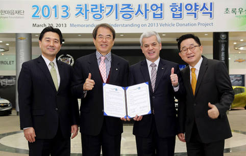 이를 위해 한국지엠은 최근, 한국지엠 부평 본사 홍보관에서 한국지엠 세르지오 호샤 사장을 비롯해 이제훈 초록우산 어린이재단 회장과 이홍렬 홍보대사 등 관계자들이 참석한 가운데 ‘2013년 차량기증사업’에 대한 상호협약을 맺고, 전국 사회복지기관 및 시설에 차량을 전달하기로 했다.