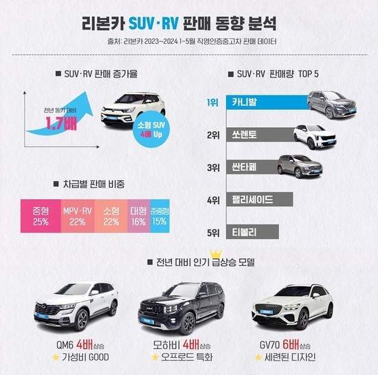 이러한 SUV·RV 선호 현상은 중고차 시장에도 고스란히 반영되고 있다. 비대면 직영인증중고차 ‘리본카’의 SUV 판매대수는 1~5월 전년동기 대비 1.7배 늘었다.