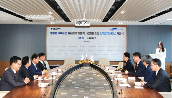 지난 22일 KG 타워(서울 중구 소재) 에서 열린 MOU 체결식에는 KGM 곽정현 사업전략부문장과 삼성SDI 최익규 소형사업부장을 비롯해 관계자들이 참석했다.