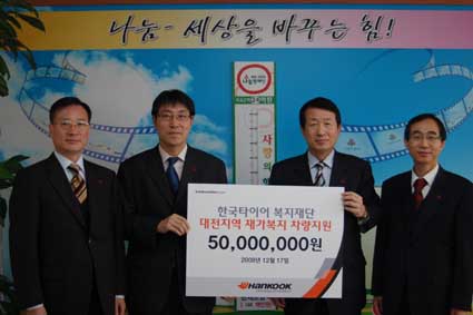 한국타이어 복지재단은 17일 오전 9시 30분 충남도청에서 김동완 충청남도 행정부지사, 한국타이어 정성호 금산공장장, 박찬웅 복지재단 국장 등이 참석한 가운데 "동그라미 사랑과 함께 하는 겨울" 행사의 일환으로 지역 차상위계층 지원을 위한 1억원 기증식을 가졌다. 올해로 4회째를 맞는 이번 행사는 정부의 기초생활수급 대상에 들지 못하는 저소득계층인 지역 차상위계층을 돕기 위해 마련된 것으로 충남지역 200세대에 각각 50만원씩 총 1억원의 생계비를 지원하게 된다. 지원을 받게 되는 대상자는 1차적으로 해당 지방자치단체의 선정작업 및 복지재단측의 현장 실사 등을 거쳐 최종 선정되었다. |