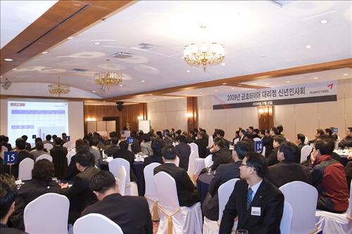 4일 코엑스 인터컨티넨탈을 시작으로 5일 대전 유성호텔, 6일 부산 파라다이스 호텔에서 대리점주를 대상으로 2009년 금호타이어 영업 전략 및 우수 대리점 포상 등을 발표하여 유통망과의 유대관계 강화 및 금호타이어 목표와 핵심 전략을 공유하고 고객 서비스 마인드를 다지는 계기를 마련했다. 3차례에 걸친 이번 대리점 신년회는 전국 대리점주 400 여명이 참석한 가운데 실시됐으며, 최근 시장 상황과 관련하여 시장 및 업계 정보를 공유하고 내수 시장의 영업 활동에 박차를 가하는 결의를 다졌다. 금호타이어 김병추 영업 담당 사장은 이 자리에서 "지난 2008년 어려운 여건 속에서도 소기의 성과를 달성한 것에 감사의 뜻을 전하고 2009년 급격한 실물 경기 악화로 예측 불허의 시장 상황이 전개되고 있지만 위기를 기회로 만들어 재도약을 할 수 있는 발판을 마련하자며 유통 부문에 대한 선택과 집중, 효율적인 마케팅 전략 실행, 고객 관리에 대한 투자 등을 언급하며 많은 관심과 노력을 당부한다"고 말했다. |