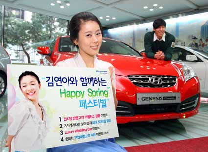 현대차는 3월부터 4월까지 두 달 동안을 "행복한 봄의 축제(Happy Spring Festival)" 기간으로 정하고, 다양한 이벤트 및 판촉 활동을 펼친다고 5일 밝혔다. 우선, 전시장 방문 고객을 대상으로 당첨 인원 1만 2천명, 총 10억 원 규모의 경품 이벤트를 실시한다. 6일부터 다음 달 30일까지 현대차 전국 지점 및 대리점을 방문하는 고객이면 누구나 응모권을 받을 수 있다. 응모권의 행운번호를 홈페이지에 응모하면 ▲ 100만원/50만원 차량구매 우대권(각 500명, 1,500명), ▲ 코오롱 등산가방/크로스백(각 1,000명, 5,000명), ▲ 김연아 피겨 음악 CD(4,000명) 등 푸짐한 경품의 당첨 여부를 즉석에서 알 수 있다. 또한, 이벤트 기간 중 현대차 지점 및 대리점 방문 고객에게는 현대차의 기업 PR 모델로 활동하고 있는 김연아의 브로마이드를 선물로 증정하며, 즉석 당첨 확인에서 행운을 잡지 못한 고객도 이벤트 기간 종료 후 추첨을 통해 ‘클릭’의 주인이 될 수 있는 기회가 남아 있다. |