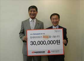 `희망 나눔 캠페인"은 소비자의 비용 부담을 줄이기 위한 실속형 제품인 `스마트 타이어" 출시를 기념하고 불황 속에서 이웃들과 어려움을 함께 나누자는 취지로 진행됐다. 한국타이어는 판매되는 스마트 타이어 1개당 1천원을 적립하고 회사측 기부금도 합쳐 3천만원을 마련했다. 한국타이어는 1990년 비영리법인 `한국타이어복지재단"을 설립하고 장학사업과 소년소녀 가장 지원사업, 무료급식 지원, 차상위계층지원 등의 복지 활동을 수행해 왔다. |