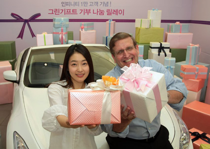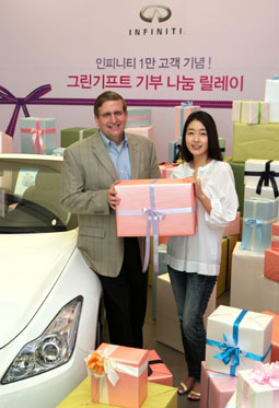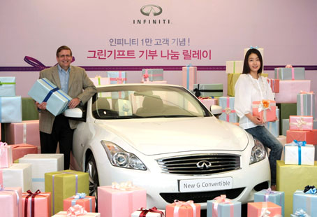국내외 기업 중 최초로 인피니티가 동참하는 ‘그린기프트’는 서울시가 공공기관 최초로 진행하는 기부 프로그램으로 승진, 영전, 가족 기념일에 선물이나 기념품 대신 주인공의 이름으로 기부하는 프로그램이다. 주인공은 축하카드와 함께 세액공제용 기부금 영수증을 축하선물로 받아 자연스럽게 기부문화에 동참하는 계기가 된다. |