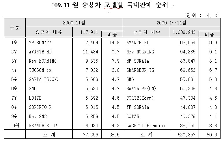 모델별 판매순위는 아반떼가 1위를 차지했으며, 다음으로 뉴모닝, NF쏘나타, 그랜저TG, SM5, 싼타페, 포르테 순으로 나타났다. 랭킹 10위권에는 ▲현대(아반떼HD, NF쏘나타, 그랜저TG, 싼타페, YF쏘나타)가 5개 모델, ▲기아(뉴모닝, 포르테, 로체이노베이션)가 3개 모델, ▲GM대우(라세티프리미어), ▲르노삼성(SM5)이 각각 1개 모델씩 차지했다. |