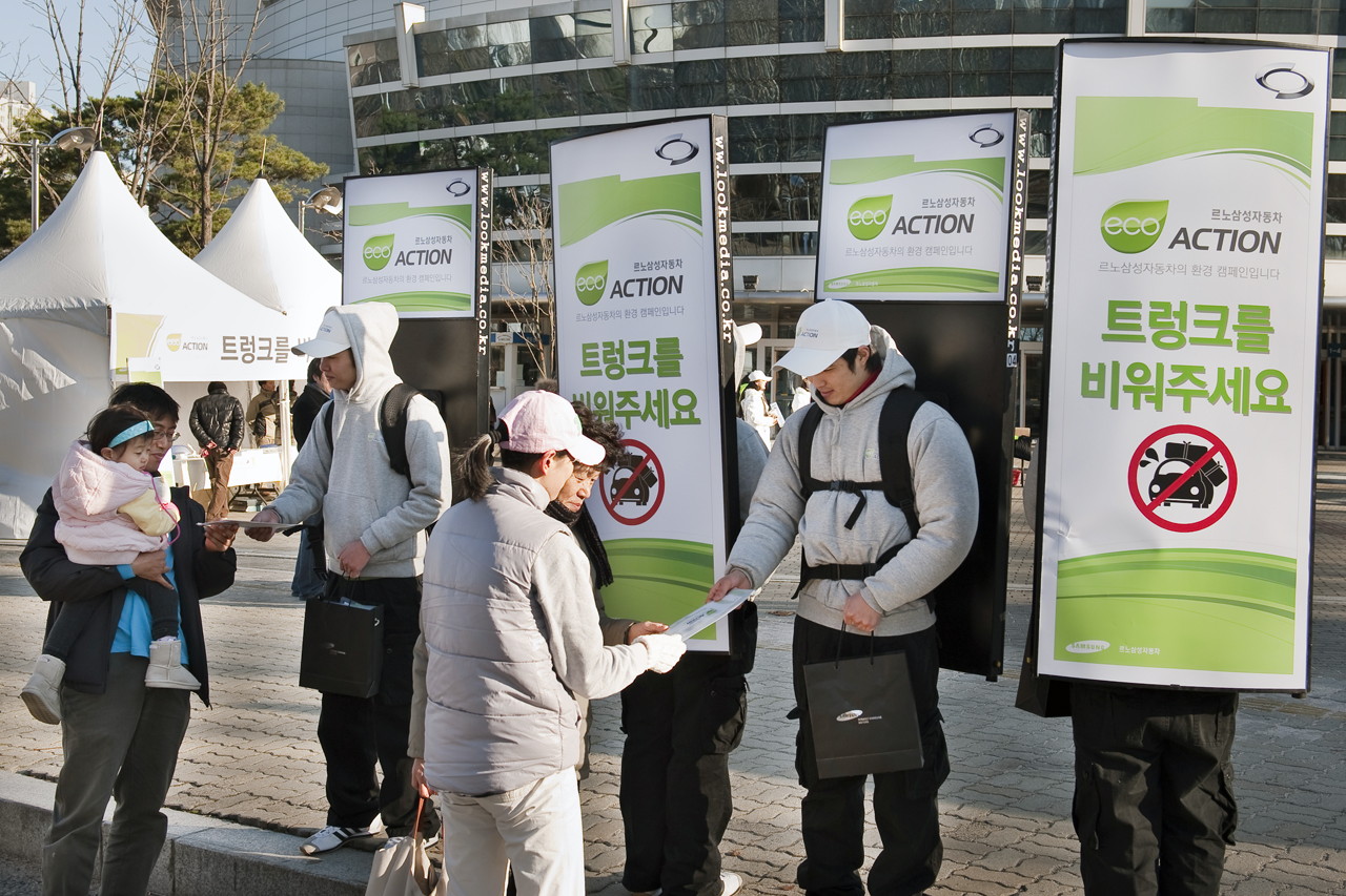 이번 행사는 지난 3일 서울 양평사업소에서 장 마리 위르띠제 사장 등 100여명의 관계자들이 참여한 가운데 개최한 캠페인 출정식에 이은 첫번째 행사다. ‘트렁크를 비워주세요’ 이벤트는 자동차 트렁크에 불필요한 물건을 싣고 다니면서 발생하는 과도한 연료 소모 및 연비 저하를 방지하고, 배기가스 발생으로 인한 공해를 줄이자는 취지로 진행되는 친환경 캠페인이다. 이날 행사는 ‘트렁크를 비워주세요’ 캠페인을 시민들에게 소개하고 동참을 유도하는 취지로 열렸다. 휴일을 맞아 올림픽공원을 찾은 시민들을 대상으로 가진 이번 행사에서는 도우미들과 시민들이 함께 참여하는 친환경 퀴즈이벤트를 열어 즉석사진 촬영의 기회를 제공했다. 또 참여한 모든 시민들에게는 재미있는 만화 형식으로 구성된 친환경캠페인의 필요성을 강조한 안내문과 차량 부착용 "eco ACTION" 스티커를 나누어 주는 등 다채로운 행사를 진행했다. |