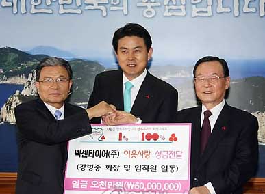 넥센타이어 강병중 회장은 8일 불우이웃을 위해 사용해 달라며 성금 5천만원을 김태호 지사에게 전달했다. 이 성금은 경남사회복지공동모금회에 전달돼 독거노인, 소년소녀가장 등 어려운 이웃을 돕는데 쓰일 예정이다. 넥센타이어는 경남 양산시에 본사를 두고있으며 지난해 9월 1조원을 투자해 창녕에 제2공장을 건립하기 위한 투자협약을 경남도와 체결한 바 있다. |