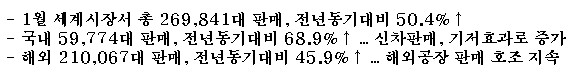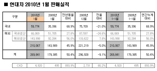 이는 전년동기대비 50.4% 증가한 실적이다. ▶국내시장= 6만대 판매 전년동기비 69% 증가...쏘나타 1위 현대차는 2010년 1월 국내에서 전년동기대비 68.9% 증가한 59,774대를 판매했다. 쏘나타가 신형 13,928대, 구형 1,434대를 합해 총 15,362대가 팔려 내수 판매 1위를 차지했다. 아반떼 8,092대(하이브리드 포함), 그랜저 5,391대 등 대부분의 차종이 전년보다 판매가 늘면서 승용차 판매는 전년동월대비 59.6% 증가했다. 또한 투싼ix가 5,229대, 싼타페가 4,767대가 팔린 데 힘입어 SUV 판매 역시 전년보다 115.2% 증가했다. 이 같은 판매 증가에 대해 현대차는 “작년 1월 국내 자동차 수요가 1998년 외환위기 이후 최저수준에 머물러 현대차도 3만5천대 판매에 그쳤다”며 “이에 따른 기저효과와 함께 쏘나타, 투싼ix 등 신차 판매 효과가 더해진 것”이라고 설명했다. 한편, 노후차 지원책 종료로 수요가 집중된 전월(09년12월)과 비교해서는 국내 판매가 21% 감소했다. ▶해외시장=21만대 판매 전년동기비 46% 증가 해외시장에서는 1월 한 달간 국내생산수출 66,069대, 해외생산판매 143,998대를 합해 총 210,067대를 판매해, 전년동기대비 45.9% 증가한 실적을 올렸다. 중국•인도공장 호조 및 체코공장 본격 가동에 힘입어 해외공장판매가 전년보다 56% 증가하는 등 호조세를 이어갔다. 국내생산수출 역시 작년보다 27.8% 증가했다. 현대차 관계자는 “올해는 위기 후 세계 자동차 산업의 재편과 경쟁심화가 예상된다”며 “이런 가운데 글로벌 선두권 업체로 도약할 수 있도록 모든 노력을 기울일 것”이라고 밝혔다. 한편, 현대차의 올해 글로벌 판매 목표는 346만대다. |