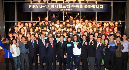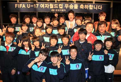 13일 제주 해비치 호텔 그랜드볼룸에서 열린 ‘환영의 밤’ 행사에서는 대표팀 선수단과 선수단 가족, 이회택 대한축구협회 부회장 및 현대차 관계자등 100여명의 참석자들이 한마음으로 태극소녀들의 우승을 축하했다. 선수들은 이날 행사에서 인기 아이돌그룹 빅뱅의 멤버 승리와 개그맨 정형돈씨 등 유명 연예인들이 등장하자 매서운 눈빛의 축구선수에서 아이돌에 열광하는 순수한 소녀들의 모습을 보여 주위를 웃음바다로 만들었다는 후문이다. 아울러 14일과 15일에는 주상절리, 테디베어박물관 등 제주 곳곳의 명소를 둘러보고, 요트투어, 승마, 잠수함 투어 등 그 동안 접해보지 못했던 레저와 자유를 만끽하며 재충전의 시간을 가질 예정이다. 현대차 관계자는 “한국 축구사에 신기원을 기록한 대한민국의 태극 소녀들을 축하하고 격려하기 위해 이번 행사를 준비했다.”며 “현대차도 U-17 여자축구대표팀처럼 세계 시장을 선도하는 글로벌 No.1이 되기 위해 끊임없이 정진할 것”이라고 덧붙였다. |